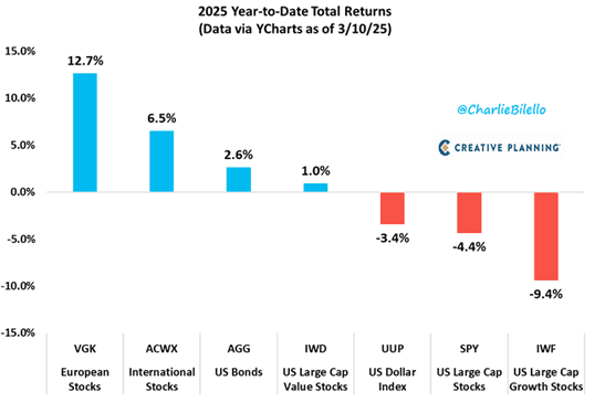 In this environment, a diversified portfolio has proven its worth. Bonds have provided their intended diversification benefits, international equities have outperformed (largely due to US policy implications), and value/defensive stocks have surpassed growth stocks.