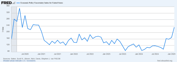 The administration’s volatile tariff and foreign policy, combined with the ambiguous endgame to DOGE’s efforts, has generated significant market uncertainty. And if there is one certainty about markets, it’s that markets hate uncertainty. Companies are struggling to plan orders and capital investments amidst shifting trade policies. Consumers are trying to grapple with the potential impact on their jobs and what trade policies will mean for prices. Indeed, the Fed’s Economic Policy Uncertainty Index (monthly) has now climbed to it’s highest since 2020.